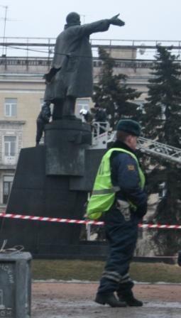 В Ленина стреляли из гранатомета (фото) Сегодня около 4-20 утра на площади у Финляндского вокзала в Санкт-Петербурге раздался мощный взрыв, сообщил «АПН-Северо-Запад» проживающий рядом с этим местом источник. Объектом нападения стал самый знаменитый в мире памятник Владимиру Ленину, на котором Ильич изображен выступающим с броневика. Утром на месте событий побывало руководство петербургского ГУВД во главе с его начальником Владиславом Пиотровским и всех остальных спецслужб города. В данный момент территория вокруг памятника оцеплена. Жителей близлежащих домов опрашивают сотрудники милиции. В СМИ появилась информация, что памятник пытались взорвать с помощью самодельного взрывного устройства. Однако характер повреждений показывает, что, скорее всего, в Ленина стреляли из гранатомета. Вход выстрела небольшой в районе бедра левой ноги, а огромный выход сзади на плаще (смотри фото). Видно, что края отверстия загнуты внутрь со стороны входа и наружу со стороны выхода. Вероятно, выстрел был произведен из машины со стороны набережной. Эту версию нашему источнику на словах подтверил и один из взрывотехников, работавших на месте событий. Этот памятник не раз подвергался нашествиям ванадалов. Так, два года назад неизвестные облили его белой краской. Кто мог стрелять в этот раз, неясно. Версии могут быть самые разные: от психически неуравновешенных фанатов белого движения, воображающих, что на дворе 1918-ый год, до спланированной провокации подкремлевских сил. Недаром в период экономического кризиса участились разговоры о необходимости выноса тела Ленина из мавзолея и осуждения коммунистического прошлого. Особенно усердствуют в этом направлении представители путинюгендов – «Молодой гвардии» и «Наших». Так, широко освещалась выходка одного из нашистов, который несколько месяцев назад вырыл яму на Волковском кладбище, рядом с могилой матери Ленина, объявив, что подготовил место захоронения для него самого.