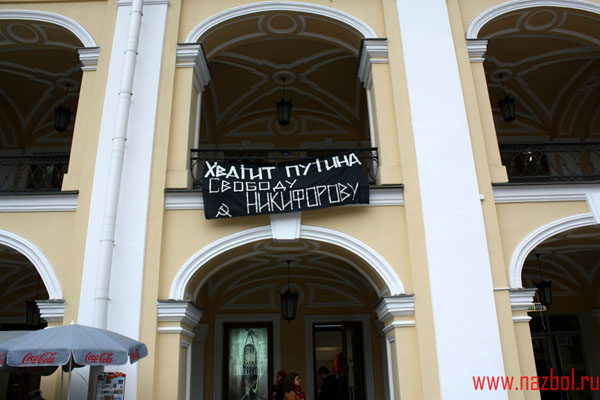 7 октября питерские нацболы поздравили Владимира Путина с днём рождения. Утром, в центре города, над станцией метро «Гостиный двор» на Невском проспекте появилась растяжка «Хватит Путина. Свободу Никифорову». Несмотря на то, что лозунг «Хватит Путина!» признан экстремистским, он будет появляться на наших акциях постоянно. Нас не запугать.