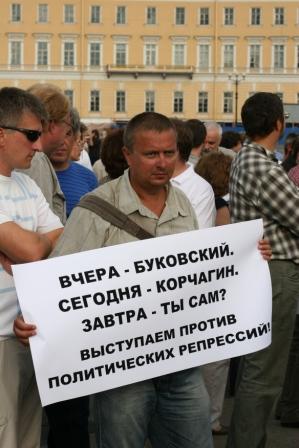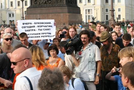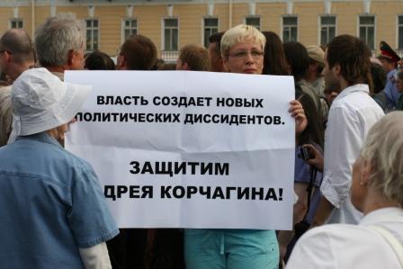 На прошедшей 31 июля акции либеральной оппозиции на Дворцовой площади появились манифестанты с плакатами в поддержку бывшего депутата ЗакСа Андрея Корчагина. «Вчера – Буковский, сегодня – Корчагин, завтра ты сам. Выступаем против политических репрессий», «Власть создлает новых политических диссидентов. Защитим Андрея Корчагина», - гласили плакаты.