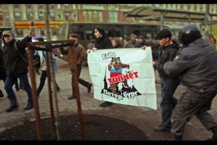 Особенно яростно ОМОН отреагировал на колонну протестующих с транспарантом "ЕдРо топчет Петербург", где был изображен медведь, уничтожающий архитектурные достопримечательности города. Акция была проведена против лобби руководителей "Единой России", которые лоббируют свой личный строительный бизнес, порождающий сносы памятников и ликвидацию культурного наследия. Наиболее одиозными представителями "единороссов"-застройщиков считаются кандидаты в депутаты Госдумы Виталий Южилин, Андрей Воробьев и Ольга Слуцкер, ответственные, в частности, за так называемую реновацию - насильственное выселение 150 тысяч петербуржцев из своих домов.